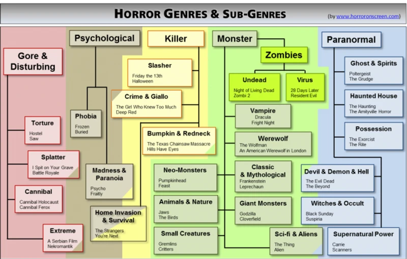 Image of Genres: Hellerman, J. (2024, January 12). Defining the horror genre in movies and TV. No Film School. https://nofilmschool.com/horror-genre